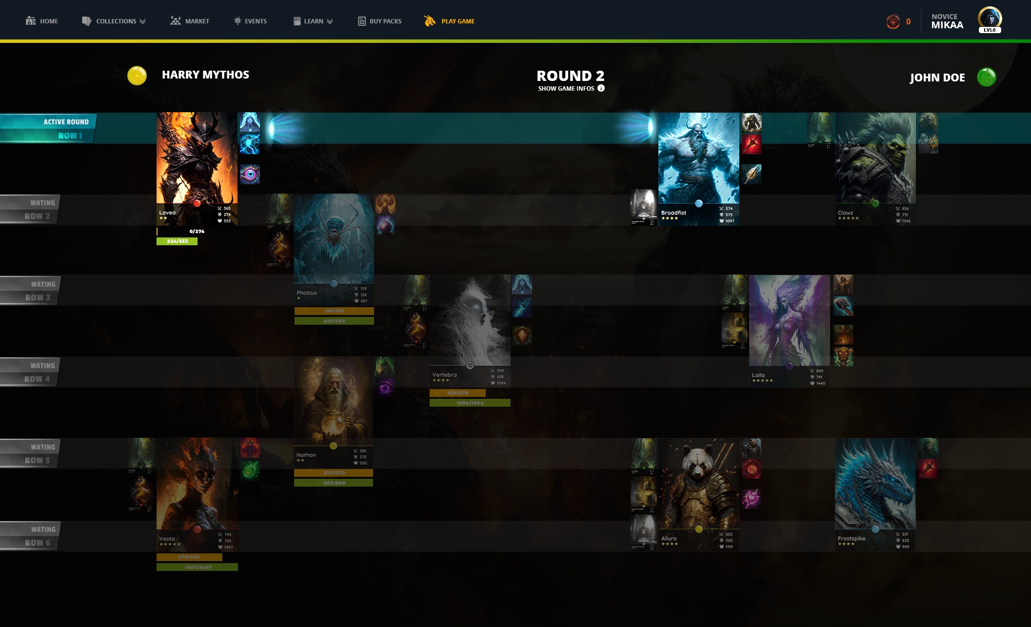 As soon as the game starts in row 1, it is displayed as active. The active cards are highlighted and marked with an effect in the appropriate place. Each row is played by all cards that touch this row.
